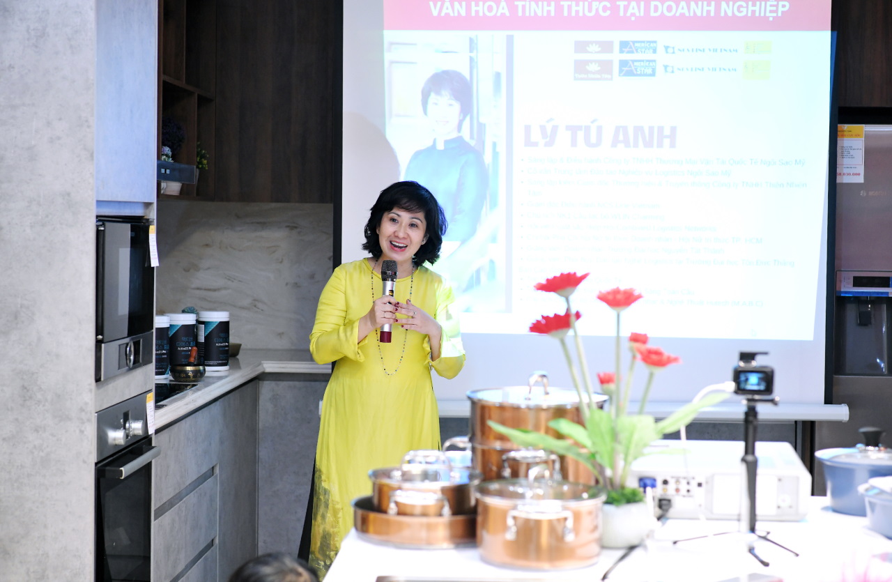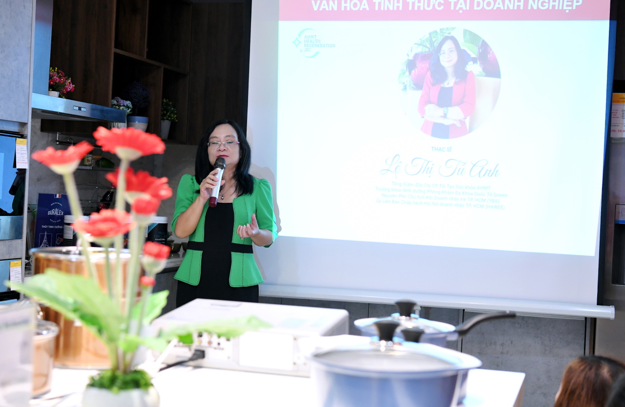 MC giới thiệu mở màn là CEO Công ty CP Tái Tạo Sức Khỏe AHMT – Ms. Lê Thị Tú Anh – Nguyên Phó Chủ tịch Hội Doanh nhân trẻ TP. HCM (YBA), Ủy viên Ban Chấp hành Hội Nữ doanh nhân TP. HCM. Và ngay sau đó, bằng giọng nói lưu loát, kinh nghiệm và kiến thức vững vàn của mình, chị đã trình bày thuyết phục về tầm quan trọng của bữa ăn sáng, đồng thời hướng dẫn cho mọi người cách có một bữa ăn sáng đầy đủ dinh dưỡng nhằm giữ gìn sức khỏe.