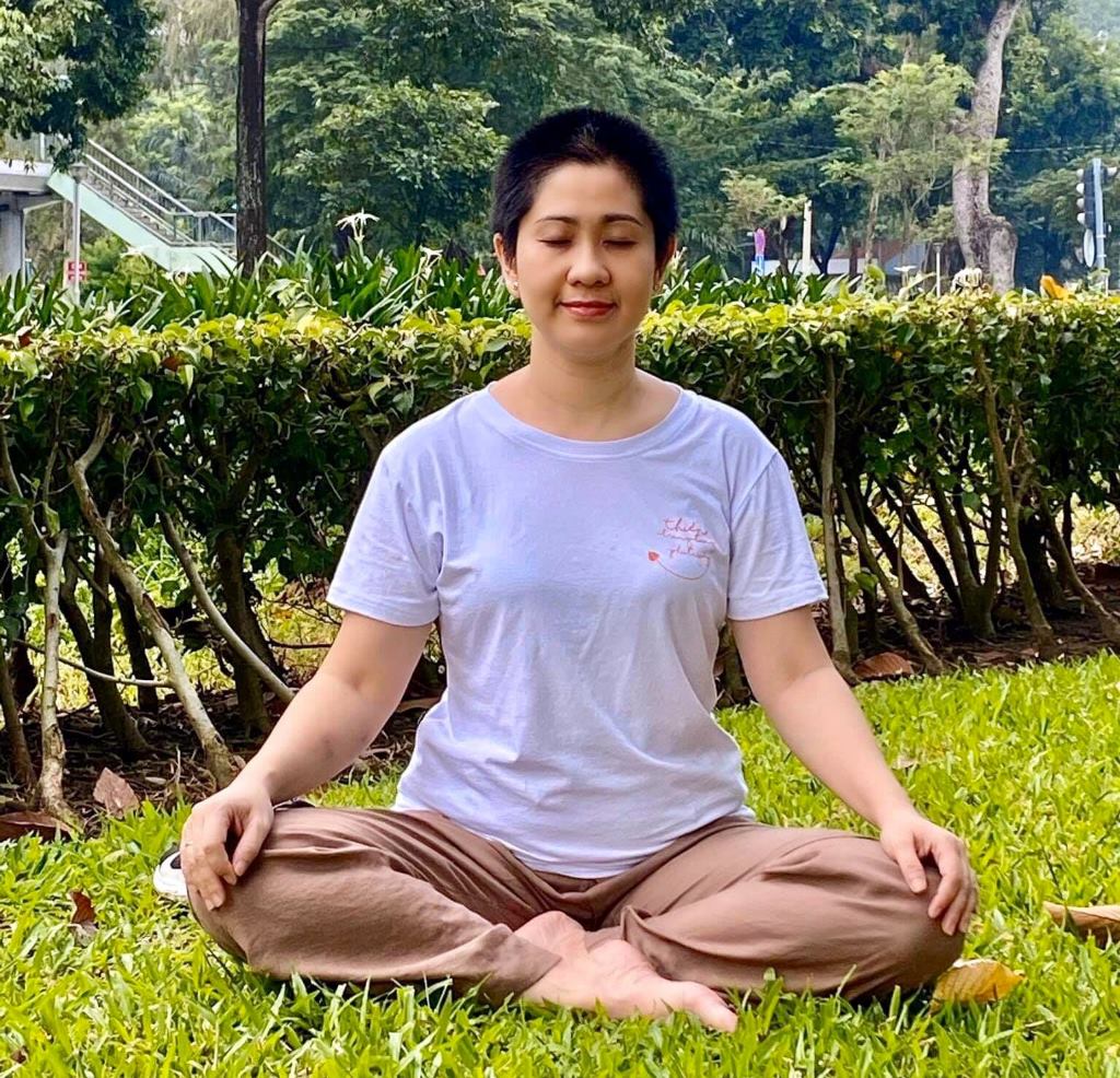 – Dạ, đây con ngồi kiểu dễ hơn nè bà, bà cứ ngồi thoải mái là được, miễn sao thẳng lưng nha bà. Bà chụp một tấm giúp con nha! Con sẽ gửi Zalo cho bà để bà xem hình và ngồi thở cho khỏe bà nhen. Con yêu bà!