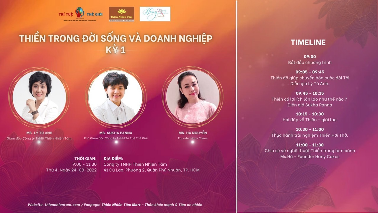 Chương trình “THIỀN TRONG ĐỜI SỐNG VÀ DOANH NGHIỆP” do Công ty TNHH Thiên Nhiên Tâm tổ chức làm nhiều kỳ với nội dung chính xoay quanh những trải nghiệm về Thiền trong Đời sống và Doanh nghiệp cùng với lợi ích lớn lao của Thiền đã được thực chứng bởi chính những Doanh nhân. Chương trình được sự đồng hành bởi Cô Sukha Panna, Phó Giám đốc Công ty TNHH Trí Tuệ Thế Giới – Phó BTC Trung tâm Unesco Nghiên cứu và Ứng dụng Thiền Vì Sức Khỏe Cộng Đồng.