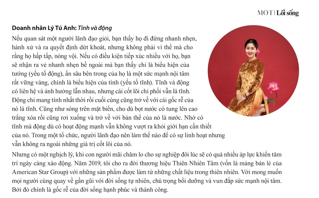 Ngày nay con người ngày càng rời xa thiên nhiên. Thêm vào đó, cuộc sống có quá nhiều áp lực khiến tâm trí chúng ta ngày càng xáo động. Tỷ lệ người mắc những chứng bệnh về tâm lý như trầm cảm ngày càng gia tăng và ở độ tuổi ngày càng trẻ. Bởi đa phần người ta chỉ chăm lo những yếu tố bên ngoài, rèn luyện sức mạnh cơ bắp và vẻ đẹp hình thể mà quên đi những giá trị bên trong. Năm 2019, tôi cho ra đời thương hiệu Thiên Nhiên Tâm (vốn là mảng bán lẻ của American Star Group) với những sản phẩm được làm từ những chất liệu trong thiên nhiên, cốt yếu là mong muốn mọi người cùng quay về gần gũi với đời sống tự nhiên, chú trọng bồi dưỡng và vun đắp sức mạnh nội tâm. Bởi tôi cho đó chính là gốc rễ của một đời sống hạnh phúc và thành công.