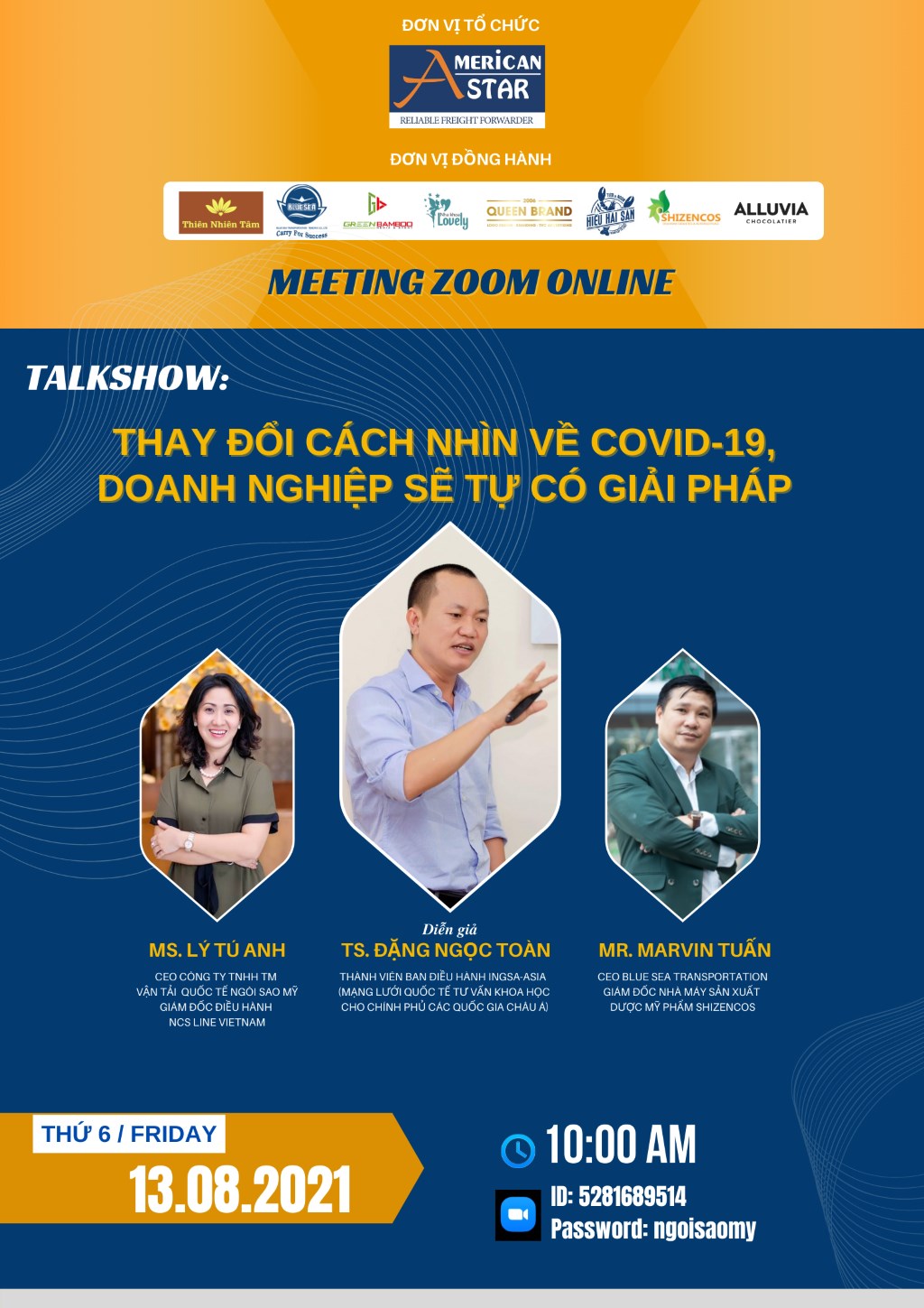 Talkshow “Thay đổi cách nhìn về Covid-19, doanh nghiệp sẽ tự có giải pháp” do Công ty TNHH TM Vận Tải Quốc Tế Ngôi Sao Mỹ (American Star Group) – đại diện bởi CEO Lý Tú Anh (cũng là người Sáng lập Thiên Nhiên Tâm) tổ chức với sự đồng hành của nhiều doanh nghiệp khác đã diễn ra thành công vào ngày 13/08/2021. Sự kiện được tổ chức trực tuyến qua Zoom với sự hiện hiện của gần 100 doanh nhân, trong đó có đại diện của nhiều tập đoàn cùng tham dự.